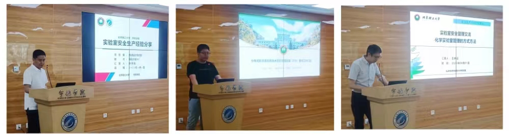 随后,三个团队的安全负责人分别从化学实验室化学品全流程管理方法,锂电池使用、充电、存储等安全管理方法,实验室合理规划布局、安全用电及环境卫生等方面进行经验分享,为各团队如何开展安全生产工作提供了新的借鉴。